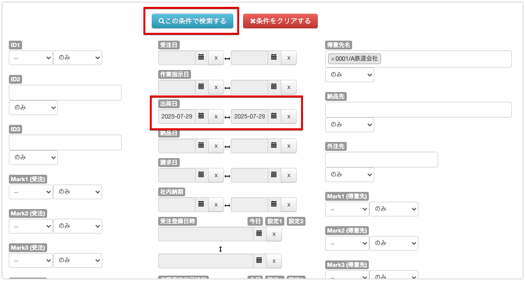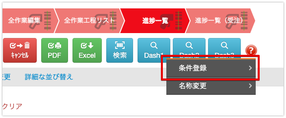 といった条件をボタンに登録しておけば、進捗画面などでのワンタッチ検索がさらに便利になります。