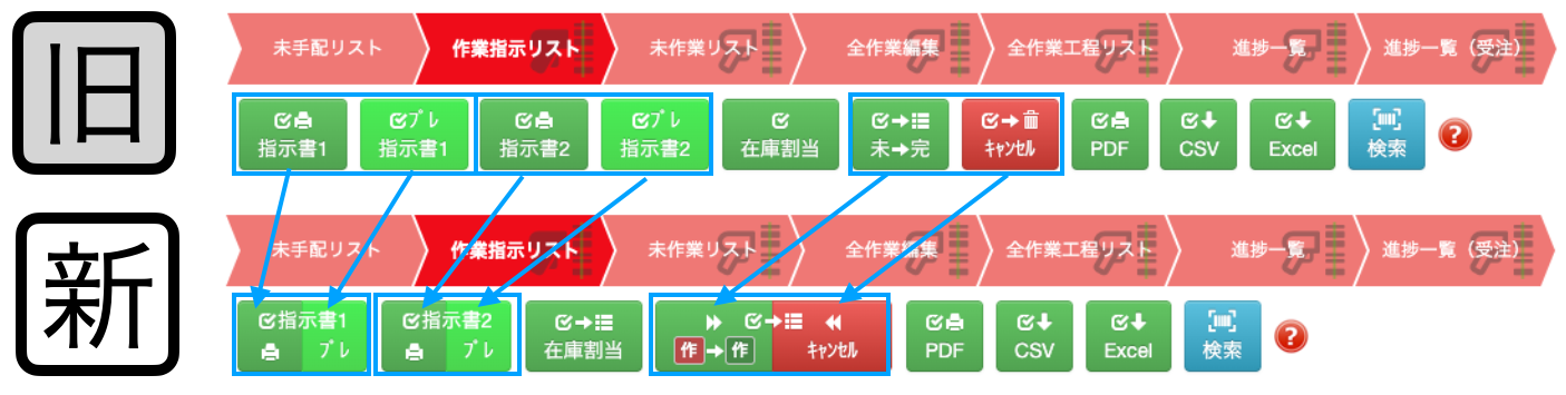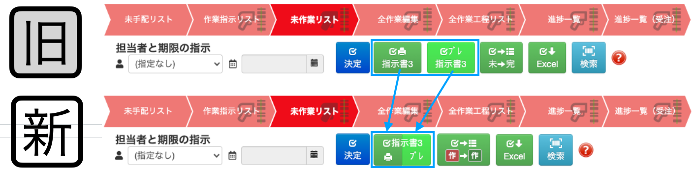 作業指示リスト、未作業リスト、全作業編集、進捗一覧などで指示書を出す場合、印刷マークがつかないプレビュー表示用ボタンと印刷マークが付く印刷用ボタンをつなげて1つのボタングループにしています。