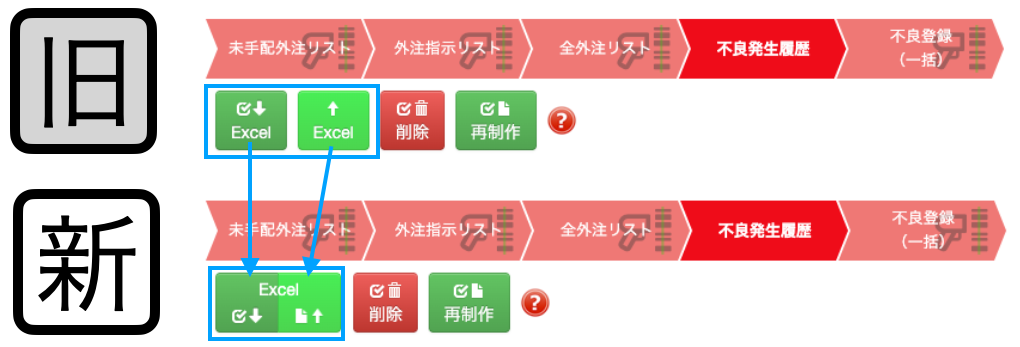 不良発生履歴などで、エクセルのダウンロードアップロードするボタンを1つのボタングループにしています。