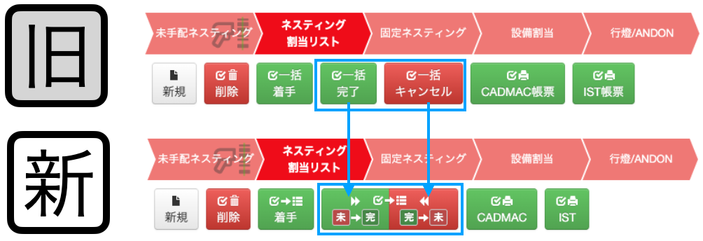 未手配ネスティングとネスティング割当リストについてのボタンも同様にグループ化しています。(機能は変わりません)