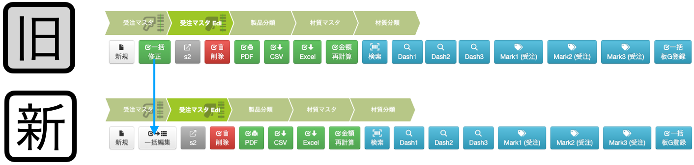 受注マスタ、受注マスタEdi、材質マスタなどはボタンの色を変更しています。